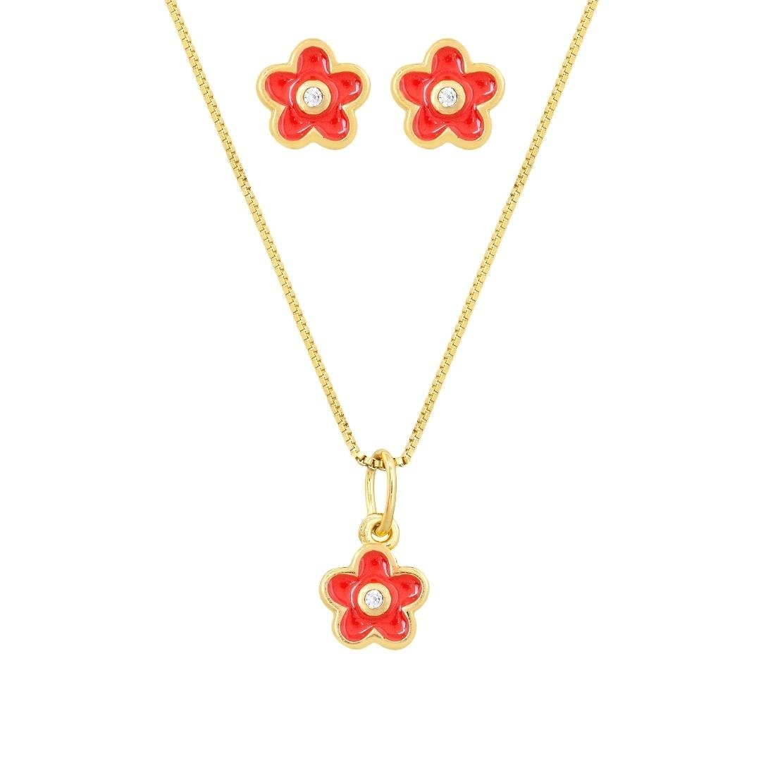 O conjuntinho com brinco e colar de florzinha resinada na cor laranja e o miolo com uma pedrinha cravejada. Semijoia banhada á ouro 18k revestida com uma camada exclusiva de verniz antialérgico. O brinco vem acompanhado com a tarraxa borboleta e a tarraxa baby.